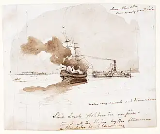 ![]() The Lord Ashburton on fire at Charleston in 1845, sketched by Ebenezer Landells