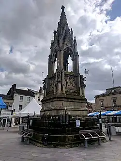 He is commemorated with a statue in London's Cavendish Square Gardens, a memorial close to the spot where he died near Worksop, and a large gothic memorial by Thomas Chambers Hine erected in Mansfield.[17]