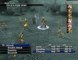 The Third Age is an RPG in the style of the games in the Final Fantasy series. The game's turn-based combat system is similar to Final Fantasy X's "Conditional Turn-Based" system (CTB), which replaced the "Active Time Battle" system (ATB) used from Final Fantasy IV to Final Fantasy IX. The primary difference between the ATB and the CTB is that in the CTB system, time pauses as the player selects commands, whereas in the ATB system, time continues to pass. As such, in the ATB system, even when the player is selecting actions, the enemy can continue to attack. In the CTB system, however, the enemy will not attack the player until the player has had their turn.[8] During battle, a "battle queue" is displayed on-screen. This shows the order in which the player's party and the enemy will take their turns. However, the order of battle can be changed by using abilities to slow down or stun the enemy, or speed up the player characters. Likewise, the enemies can increase their own speed and decrease the party's, again changing the order. The queue changes each time a turn is completed.[8] The player can only have three active party members in any given battle, but in most battles, they are free to switch party members in and out of combat. Occasionally, the player will be joined by a fourth member, who is usually a character from the films, and is controllable for one or two battles only.[8]