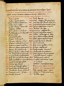 The pharmacopoeia, containing 482 recipes, was written under Benedictine auspices in Latin at Lorsch Abbey (today's Bergstraße district, Hesse), probably under Richbod, the abbot of the imperial abbey. Since the beginning of the 11th century, it has been located in Bamberg and is currently preserved in the Bamberg State Library under the call number Msc.Med.1 (old call number: L.III.8). At the Institute for the History of Medicine at the University of Würzburg, Ulrich Stoll and Gundolf Keil facsimiled, edited, and translated the manuscript into German in a three-year project that was completed in 1989. Since June 2013, the Lorsch Pharmacopoeia has been included by UNESCO on the Memory of the World international register.[2][3] The Lorsch Pharmacopoeia is the oldest German pharmacopoeia, systematically compiled as a medical compendium.[4]