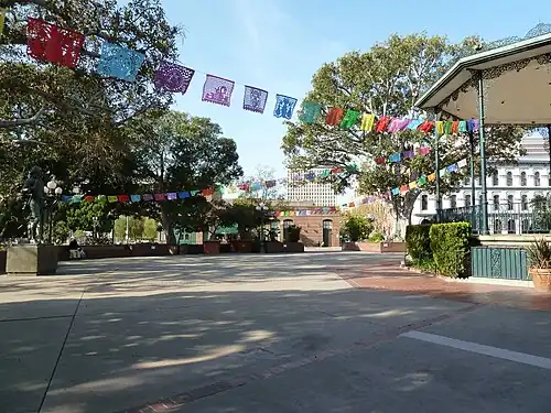 Los Angeles Plaza or Plaza de Los Ángeles is located in Los Angeles, California. It is the central point of the Los Angeles Plaza Historic District. When Spanish Governor Felipe de Neve founded the Pueblo de Los Ángeles, his first act was to locate a plaza for the geographical center from which his town should radiate. De Neve's plaza was rectangular in form—75 varas wide by 100 in length. It was located north of the church; its southerly line very nearly coincided with the northerly line of West Marchessault street. On this, the cuartel (guard house), the public granary, the government house and the capilla (chapel), fronted.[1]