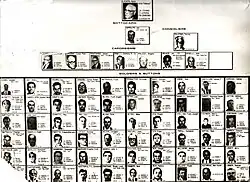 DeSimone's second underboss Nick "Old Man" Licata succeeded him. Licata had strong ties with Mafia families in the Midwest and South and maintained contact with the mob in Las Vegas.[51] By then, law enforcement knew much about mob activities in Los Angeles, which was helped by top hitman Frank Bompensiero becoming an undercover informant in 1967. In 1963, Joe Valachi outed the Mafia as a secret criminal society, aiding in law enforcements attacks on organized crime, and fingered Licata as a high ranking mobster in Los Angeles.[52] A bright spot during the period was that Louis Tom Dragna's company "Roberta Dress Manufacturing" was turning into a $10 million a year business. This was possible because in the 1950s, Jack Dragna flew labor union expert Johnny Dio in from New York City to teach Louis how to manipulate labor unions in the Los Angeles Garment District.[53] Licata had high hopes of restoring the declining family, but with the police and FBI constantly monitoring his family, Licata wasn't able to do much of a better job than DeSimone. On July 9, 1969, Licata was taken into custody after refusing to answer questions at a federal grand jury session about L.A.'s crime syndicate structure.[54] He was held in contempt of court for refusing to testify after being given immunity from prosecution and eventually served six months in prison.[54] A pair of indictments in the mid-1970s threaten to put most of the working family in prison.[55] In March 1973, seven men were arrested for running a rigged gambling operation in Los Angeles that brought in up to $250,000 a month.[56] Their trial was delayed when the key informant and witness, former Mafia associate John Dubcek, was shot and killed in Las Vegas.[56] Although this scared other informants from testifying, they still were convicted and given light sentences. Four months later another 12 men, were indicted for conspiracy, racketeering and extortion against bookmakers, loan sharks, and pornographers.[55] Licata's underboss Joseph Dippolito had a large influence in San Bernardino and the Inland Empire in both legitimate and criminal enterprises.[57] He was seen as Licata's successor, but died unexpectedly of a heart attack in January 1974 at the age of 59. On October 19, 1974, after a long battle with illnesses, Nick Licata died at age 77.