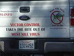 Los Peñasquitos Lagoon is one of the known breeding grounds in California of mosquitoes infected with the West Nile virus (WNV),[44][45] a virus that originated in Uganda and arrived in California in 2003.[45] The number of yearly incidents of WNV infection in San Diego County has been rising since 2008.[44] The virus is often fatal to birds, which is the primary animal affected, but horses and humans have also died from it.[46] One in five infected humans will show flu-like symptoms, and will sometimes require hospitalization for meningitis.[45] In 2009 one boy developed flu-like symptoms and became delirious a few days after having had a picnic near Los Peñasquitos Lagoon, and needed to be hospitalized for WNV infection, presumably acquired by mosquito bite.[44] Pickup trucks can sometimes be seen around the lagoon spraying for mosquitoes to prevent the spread of WNV.