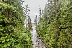 Loss Creek begins at an unnamed confluence at a point north of the settlement of Jordan River at an elevation of 507 metres (1,663 ft).[3] It flows west for 14 kilometres (8.7 mi), taking in the right tributaries Gain Creek and Noyse Creek, passing under Highway 14, and taking in the right tributary Jack Elliott Creek. It then turns south for 2 kilometres (1.2 mi), flows under a suspension bridge carrying the Juan de Fuca Marine Trail,[7] and ends at the Strait of Juan de Fuca on the Pacific Ocean, east of Sombrio Point[8] and south east of the settlement of Port Renfrew.[1][2][4] The average slope is 3.2% over 16 km (507m/16000m=0.03169). Rapids of 12% slope exist near the mouth of the tributary Gain Creek. The steeper the slope the higher the uplift versus erosion. This indicates an anomaly of uplift compared to the rest of the valley.