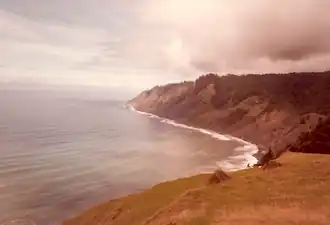 The Lost Coast is a mostly natural and undeveloped area of the California North Coast in Humboldt and Mendocino counties, which includes the King Range. It was named the "Lost Coast" after the area experienced depopulation in the 1930s.[1] In addition, the steepness and related geotechnical challenges of the coastal mountains made this stretch of coastline too costly for state highway or county road builders to establish routes through the area, leaving it the most undeveloped and remote portion of the California coast.[2] Without any major highways, communities in the Lost Coast region such as Petrolia, Shelter Cove, and Whitethorn are somewhat isolated from the rest of California.