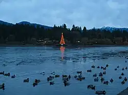 The next controversy surrounding the lake followed the proposal for a fountain to be erected in the lake to coincide with the city's Golden Jubilee anniversary celebrations in 1936. For the mayor, it would be "a miracle of engineering," with the spray of water lit by virtually "limitless combinations" of colour.[10] The public, in contrast, were not impressed by the proposal. Its $33,019.96 price tag was considered extremely frivolous in the midst of an economic crisis. As written in The Sunday Sun Edition of the Vancouver Sun Newspaper, Saturday, August 8. 1936. The lead story in the Magazine section is; SECRETS OF THE FOUNTAIN. It was the conception and idea of then, Chief Electrical Engineer, Robert Harold Williams with Hume and Rumble Ltd. electrical contractors. R.Harold Williams designed and supervised the erection of the Vancouver's Golden Jubilee fountain. After a business trip to Los Angeles he saw a fountain and thought this would be a great gift for the city for their up and coming birthday, Golden Jubilee celebration. To build the fountain, Lost Lagoon was drained. Seventy piles were driven into the mud. On these a concrete mat was laid. The fountain was built upon this mat. The work was of necessity rushed; it was done in a month. "The fountain is worthy of all the traditions of art, worthy of Vancouver's Golden Jubilee, and it will be a permanent, decorative joy in Stanley Park". "When operating , it is like a symphony concert, in motion and color instead of music, says Harold Williams, engineer, of Hume & Rumble Ltd., under whose personal supervision the work has been done." Vancouver's Jubilee Committee and private citizens who contributed are to be commended on their work in pushing for this beautiful fountain, which is sure to be one of the major attractions during the Golden Jubilee celebration. "We've had to hurry," says Mr. Williams," in that time 285 tons of cement have been utilized and all the special equipment was built." All equipment was built in Canada and the pumps were constructed in Vancouver. All union labor was employed.[11] It was restored for Expo in 1986.[12]