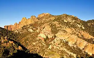 Lost Mine Peak is located in Big Bend National Park and the Chisos Mountains. It ranks as the third-highest peak in the park, mountain range, and county, but only the 20th-highest in Texas.[1][2] The mountain is composed of volcanic rock which formed during the Oligocene period.[5] Although modest in elevation, topographic relief is significant as the summit rises 2,150 feet (655 m) above Pine Canyon in 0.8 miles (1.3 km), and 2,550 feet (777 m) above Juniper Canyon in 1.5 miles (2.4 km). Based on the Köppen climate classification, Lost Mine Peak is located in a hot arid climate zone with hot summers and mild winters.[6] Any scant precipitation runoff from the mountain's slopes drains into the Rio Grande watershed. The lower slopes of the peak are covered by juniper, oak, and piñon. The mountain's toponym has been officially adopted by the United States Board on Geographic Names.[3] The peak's name comes from a legend of Spanish explorers finding silver here and enslaving local people to mine it. According to legend, the workers eventually rebelled, killed their enslavers, then sealed the entrance to prevent further exploitation.[7][8] The Lost Mine Trail was built in the 1930s by the Civilian Conservation Corps and is the most scenic and popular trail within Big Bend National Park.[9] The trail covers 4.8 miles (round-trip) with 1,000 feet of elevation gain.[10]