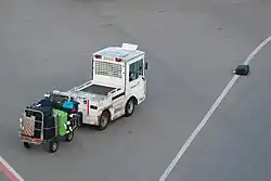 Airport baggage vehicle returns to its lost luggage at the edge of the marked "road" on the tarmac.