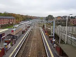 ![]() Lostock station (2005), looking east. The Wigan lines on the right (with no platforms) can be seen joining the main line in the distance. | |||||