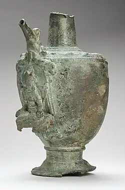 The earliest known examples of lota and kindi in ancient India are from the Chalcolithic period, notably in the Savalda Culture and two well-preserved examples from the pottery of the Jorwe Culture, dating back to the 2nd millennium BCE.[2][6] Highly decorative spouted vases with floral motifs are also known from Chandraketugarh, dating back to around the 2nd century BC or the 1st century CE. The earliest lotas were made of clay or teracotta while modern versions are notably metal.[7]