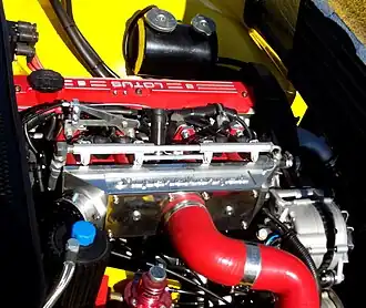 As early as 1964, Lotus recognised the need to find a replacement for the Lotus Twin Cam engine.[2] Colin Chapman issued a brief that listed the features to be required in a new engine, including 'high efficiency, flexibility, torque and smoothness which was suitable for hand assembly'.[3] Unable to find this combination in any existing engine, the company used outside consultants and internal resources to define the characteristics of the next Lotus engine.[4] After having rejected a 120° V6 due to being too wide for Lotus' chassis and a 60° V6 as too tall for the intended bodywork, the engineers determined that a 2-litre inline-four engine was the optimal choice. This future engine would have four valves per cylinder (16 valves total) operated by belt-driven dual overhead cams and develop 150 hp (112 kW). The block would be angled at 45° from vertical to permit a lower bonnet and simplify development of a 4-litre V8 version for future use in Indianapolis racing.