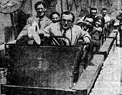 T. H. Eslick, builder of Lotus Isle, riding the monorail (center), 1930