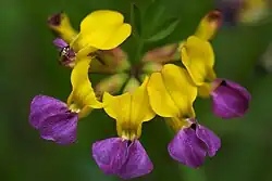 Hosackia gracilis, synonym Lotus formosissimus, is a species of legume native to western North America from British Columbia through Washington and Oregon to California. It was first described by George Bentham.[1] It is known by the common names harlequin lotus[2] and seaside bird's-foot trefoil.[3] It grows in moist spots in the coastal mountains and down to the oceanside bluffs. It is a perennial herb growing upright or spreading to about 0.5 m in maximum length. It is lined with leaves each made up of a few oppositely arranged oval leaflets up to 2 cm long. The inflorescence is made up of several pealike flowers each 1 to 2 cm long. The flower has a bright yellow banner, or upper petal, and bright pink or white lower petals. The fruit is a legume pod 2 to 3 cm long.