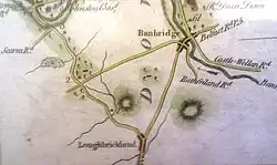 Loughbrickland may have been the site where the Three Collas fought the Battle of Achadh Leithdheirg in 331 AD, defeating the forces of Fergus Foga, king of Ulster.[2][3] The victors killed Fergus and burned Emain Macha, the famous palace of the Ultonian kings, to the ground. The sovereignty of Ulster thus passed from the race of Ir to the race of Heremon. John O'Mahony the Gaelic scholar states that the battle site was commemorated by "a huge Carn of loose stones near Loughbrickland".[4] Samuel Lewis (publisher) in his "Topographical dictionary of Ireland - County Down" states - "At Drummillar is a vast cairn of loose stones, 60 feet high and 226 feet in circumference."[5] This Carn, known as Carn Cochy in the Annals of the Four Masters, stood seventy feet high but appears to have been destroyed when the Scarva to Banbridge railway line was constructed in 1859. What appears to be the Carn can be seen on the image of a 1778 map as a huge pile of stones to the left of the Loughbrickland to Scarva Road, about 2 miles outside Loughbrickland.