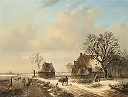 In the later part of his career he strived for innovation, but from 1837 onwards he became stuck in ever-changing winter landscapes. This type of winter landscapes had become popular due to the work of Barend Cornelis Koekkoek and Andreas Schelfhout. Louis-Pierre Verwee depicted these landscapes with low-hanging, heavy snow clouds over wintry land and waterways and dotted with figures. He used light blue and metallic gray in his color palette in an effort to suggest the intimate, moody aspect of such landscapes. In some of these paintings Florent Willems and Verboeckhoven painted the figures.[3]