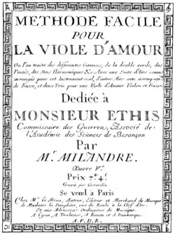 Milandre's Méthode facile pour la viole d'amour (Easy Method for the Viola d'amore), published in 1771[2] (previously thought to be published in 1782), contains thorough information on viola d'amore technique, along with a selection of arrangements and compositions. The method remains an important pedagogical volume.[2]