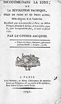 - Les Deux Nicodèmes, ou Les Français sur la planète de Jupiter. Paris, Théâtre Feydeau, 21 November 1791.