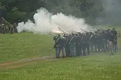 On January 23, 1865, 80 "colored" troops of Company E, 5th US Colored Cavalry, under command of 2nd Lieutenant Augustus Flint, were assigned to move almost a thousand head of cattle from Camp Nelson to the stock yard at Louisville, Kentucky. The men were mostly assigned to the front and rear of the spread out herd of cattle. About 41 men were bringing up the rear on January 25 near Simpsonville, when they were ambushed by Confederate guerrillas. Very few of the Union troops were able to fire their muzzle-loaded Enfield infantry rifles, due to fouled powder. The guerrillas were armed with 6-shot revolvers, and most carried two or more. As Confederates quickly closed the distance, almost all of the "colored soldiers" bringing up the rear were wounded or dismounted. Only two escaped harm, one by playing dead, and the other hiding under an overturned wagon box. The forward group panicked and fled.[25]