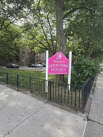 Construction of the Pink Houses began in the summer of 1957 and was designed by architects Aldoph Goldberg and Herbert Epstein.[2] The development was completed on September 30, 1959. It was named after a former member of NYCHA, Louis Heaton Pink who was a pioneer of low and middle-income housing. The first eight families moving in March of that year. The project cost $21 million dollars.[3][2] The site is cut through by two streets, which form four superblocks with buildings on only 14% of the site. Each cluster of buildings contains its own playground maintained by the Parks Department.[2]