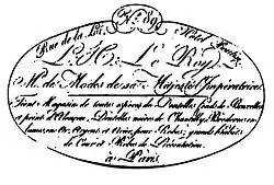 At the head of Hippolyte Leroy's bill, "Fashion Merchant of her Majesty the Empress [Joséphine]", Maison Boutin, rue de la Loi (now rue de Richelieu) in Paris.