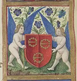 The coat of arms of Malet de Graville's family depicts three golden clasps or buckles on a red background; or, in heraldic terms, gules, three buckles or.[b] It dates to at least the 13th century, and derives its tincture from the colours of Normandy, red and gold.[11] Louis had his illuminated manuscripts and the buildings he built or repaired heavily decorated with his coat of arms. It is often displayed together with one or several anchors, symbols indicating his elevated rank as Admiral of France.[12] That he entertained a personal interest in heraldry is further reflected by his ownership of the oldest preserved illustrated armorial of France, the Armorial Le Breton, which was part of his extensive library.[13]