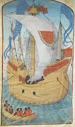 In 1483, when the position of Admiral of France became vacant, it was offered to Louis. He would retain it until his death, with the exception of the years 1508–1511, when it was held by his relative Charles II d'Amboise.[24] It was a prestigious and lucrative position, one of the Great Officers of the Crown of France and equal in status to the Constable of France.[25] The duties included upholding maritime justice and the suppression of piracy, support to seamen, and the validation of seized prizes; the latter also included the right to a very profitable percentage of the value of all captured goods. The admiral was supported by a general lieutenant, as well as lieutenants in all ports. In practice his authority only included the coastal waters of Normandy and Picardy, since Provence, Brittany and Guyenne were under the authority of regional admirals.[25][26] Louis was furthermore made governor of Normandy, and captain of the ports of Saint-Malo, Dieppe and Honfleur.[27] In 1493, he was made a knight of the Order of Saint Michael.[28]