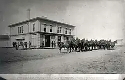 The settlement now faced a possible threat, from cross-border Fenian raids coordinated by his former associate William Bernard O'Donoghue.[41] Archibald issued a call to arms in October, and assured Riel that if he participated he would not be arrested. Riel organized several companies of Métis troops for the defense of Manitoba. When Archibald reviewed the troops in St. Boniface, he made the significant gesture of publicly shaking Riel's hand, signaling that a rapprochement had been effected.[42][41][6]