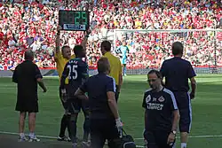 In the 2007–08 season, Saha returned from injury and came as a substitute against Sunderland, scoring the winning goal.[103] On 23 September 2007, Saha won and converted a penalty against Chelsea in Chelsea's first game with Avram Grant in charge. United won the game 2–0.[104] This earned Saha a recall to the France national team after a year out. Against Arsenal, Saha came on to replace the under-performing Carlos Tevez in a 2–2 draw. He was key in setting up a goal as Cristiano Ronaldo gave United a 2–1 lead.[105] Saha continued to make appearances off the bench, but when Wayne Rooney was ruled out for a few weeks he partnered Tevez up front.[106] He then started in a match against Sunderland on Boxing Day, and scored twice including a penalty, winning 2–0 to lift Manchester United to 1st position in the Premier League.[107] After being sidelined with a knee injury that kept him out for a month, Saha made his return in an FA Cup clash versus Arsenal on 16 February 2008, winning 4–0.[108] The following weekend, he came on as a substitute for Ronaldo, scoring the final goal in a 5–1 rout of Newcastle United.[109] After returning to nearly full fitness, Saha's injury haunts returned and forced him off with a hamstring complaint during United's win over Bolton Wanderers at Old Trafford.[110] Saha was ruled out for several weeks, missing key games.[111] In the final game of the Premier League season against Wigan Athletic, Saha was named as a substitute, but played no part in the game.[112] In May 2008, Saha admitted that he believed his United career was in doubt. Despite his desire to stay and love for the club, he was unsure of what the future held for him at Old Trafford.[113]