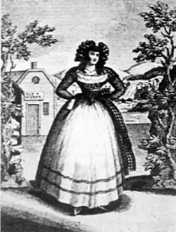 While at Dumfries, she also caught the eye of, and later married, the theatre manager, John Brown Williamson, a friend of Burns. Shortly after they were married, in 1796, the couple emigrated to Boston, America. In their American debuts in the Boston Theatre, John played the Moor in Othello and Louisa 'Little Pickle' in Bickerstaff's The Spoil'd Child. Williamson's acting was criticised in that he "lacked flexibility of countenance." Fontenelle's role, on the other hand, was described as "the most astonishing and brilliant display of theatrical genius ever exhibited in America."[5] After their first season, Williamson became manager of the Boston Theatre but his "unfortunate habit of undervaluing everything American" led to failure "through a want of co-operation and support from the stockholder." They later joined the Charleston Company of Actors in South Carolina and played in Boston and New York.[4] Fontenelle died of yellow fever at Charleston on 30 October 1799. Williamson died two years later in 1801.[6]