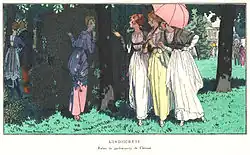 In 1912, Chéruit signed a contract to collaborate with Lucien Vogel to produce the fashion magazine La Gazette du Bon Ton. Six other top Paris designers – Georges Doeuillet, Jacques Doucet, Jeanne Paquin, Paul Poiret, Redfern, and the House of Worth – joined the project. Vogel hired leading Art Deco artists to fill the journal's pages with striking illustrations of the designers' fashions, along with essays by noted writers.[16] The magazine printed images on fine papers using the expensive pochoir technique, making it a truly exclusive venue for showcasing the couturiers' latest designs.[17] Chéruit had a special affection for the artistic style of Pierre Brissaud, and he created most of the illustrations of her work that appeared in the pages of La Gazette du Bon Ton.