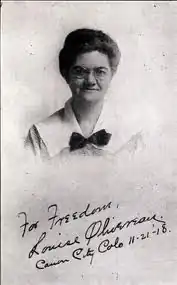 Louise Olivereau (1884-1963) was an American anarchist and war resister.[1] She was a trained stenographer and worked for the Industrial Workers of the World in their Seattle office. It was raided in 1917 during World War I because the group opposed the war. She was charged with and convicted of violation of the Espionage Act of 1917.[2] On November 30, 1917, she was convicted and given a ten-year sentence, for “interference with the draft,” for printing a small leaflet advising young men of their legal rights in relation to claiming an exemption from the draft. [3] She served 28 months of the sentence before being released in March 1920.[4]