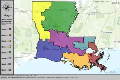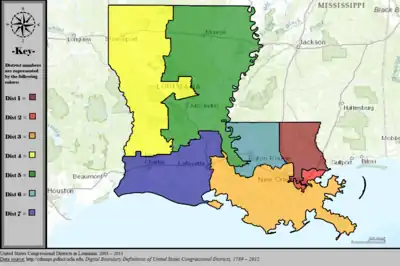 The U.S. state of Louisiana currently has six congressional districts. The state has had as many as eight districts; the eighth district was eliminated on January 9, 1993 after results of the 1990 census, and the seventh district was eliminated in 2013, following results of the 2010 census, largely because of people moving interstate after Hurricane Katrina hit the state.
