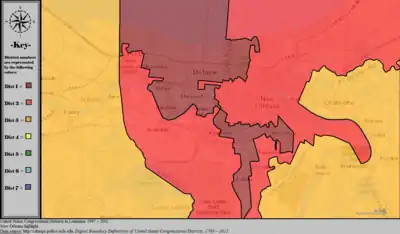 In 2023, the U.S. Circuit Court of Appeals found that the drawing of Louisiana’s congressional districts was an illegal racial gerrymander by the Republican-controlled legislature, drawn to dilute the influence of African-Americans and lock in White majorities in five out of six districts, despite the former making up a third of Louisiana's population. The court ordered the maps be redrawn with a second district with an African-American majority to reflect the state's demographics and allow them to elect a representative of their choice.[1]
