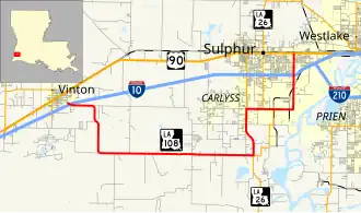 From the west, LA 108 begins at an interchange with I-10 at Exit 8 in Vinton between the Texas-Louisiana state line and Sulphur. It proceeds east for 1.7 miles (2.7 km) to Gum Island Road then curves southward for another 3.0 miles (4.8 km) to Johnny Breaux Road. Here it curves back to the east, traveling 10.0 miles (16.1 km) and crossing a bridge over Bayou Choupique before reaching an intersection with LA 27 and LA 1133. LA 27 runs south into Cameron Parish while LA 1133 zigzags around the east side of Carlyss. LA 108 turns north, running concurrent with LA 27 for 3.2 miles (5.1 km) through Carlyss to an intersection with LA 1256, which heads due north to I-10 in Sulphur. From this intersection, LA 27 and LA 108 turn to the east, and LA 27 soon turns back to the north, also connecting with I-10 in Sulphur. LA 108 continues eastward, once again intersecting LA 1133, then turns north onto Cities Service Highway. After 1.3 miles (2.1 km), LA 108 crosses a bridge over Bayou D'Inde and enters Sulphur shortly thereafter. LA 108 enters into an interchange with I-10 and continues north for 1.4 miles (2.3 km) through the Maplewood area of Sulphur to a terminus at US 90 (East Napoleon Street).[1][2][3]