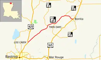 Louisiana Highway 140 (LA 140) is a state highway located in Morehouse Parish, Louisiana. It runs 14.76 miles (23.75 km) in an east–west direction from U.S. Highway 425 (US 425) in Log Cabin to a junction with U.S. Highway 165 (US 165) and LA 599 in Bonita.