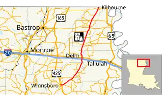 Louisiana Highway 17 (LA 17) is a state highway located in northeastern Louisiana. It runs 66.53 miles (107.07 km) in a north–south direction from the junction of U.S. Highway 425 (US 425), LA 4, LA 15, and LA 130 in Winnsboro to the Arkansas state line at Kilbourne.