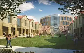 The complex will consist of four buildings surrounding a 14,000 square foot exterior quadrangle lined with covered galleries. The largest building is a four story, 56,000 square foot Rotunda. This building will be used for the Business School administration offices, and academic affairs. The ground floor will have the student’s common area, lobby and café for the Business School and the community along with a Business Disaster Recovery Command Center. The second building is a two-story structure that will be the Undergraduate Pavilion, which will include classrooms, SMART Lab and faculty offices. The third building will be known as the Graduate Pavilion and will have classrooms, study rooms, team rooms and offices for faculty. The second floor of the Undergraduate and Graduate Pavilions will contain departmental offices for Management, Marketing, ISDS, Accounting, Economics and Finance, as well as Ph.D. suites. The fourth building will be the auditorium. This two-story, 12,600 square foot building can seat 300 people and will be used by the Business School and the community. The second floor of the Auditorium will have graduate classrooms and labs. Both Pavilions and the Auditorium will connect through covered archways on the first floor and enclosed walkways on the second floor.