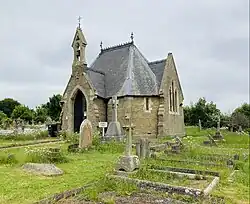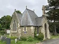The cemetery has two chapels, one for Church of England funeral services and another for Dissenters. Designed by Lincoln architects Bellamy and Hardy, the chapels and the gate lodge were built in 1855 in brick with 'cut-away' corners and tall bellcotes over the porches.[5] The two chapels and the gate lodge were completed for £2,700.[8] The gatehouse lodge is in brick and stone dressings. A gothic arched carriageway running below the building. Tudoresque with octagonal tower with battlements. The building is entered at carriageway level through a door set in the tower. The central portion has an oriel window with an inset panel towards the top of the front elevation with the inscription 'ERECTED A.D. 185-' (the final numeral is now missing). The gatehouse was sold by Louth Town Council in 2019 and has now been brought back into domestic use. [9] Today one of the chapels is used by the local Eastern Orthodox Church community as St Æthelhard's Church,[10] Æthelhard having been abbot of a monastery at Louth before being named to the diocese of Winchester.[11] The other is now used for storage for the equipment necessary to maintain the grounds of the cemetery and as a base for the groundsmen.