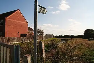 The abbey was situated on an elevated area of ground, of around 23 acres, south of the River Lud.[3] The river was used by the abbey to turn the wheel of the grain mill that had been given to them by Alexander of Lincoln 'to ever more to possess', but was too distant for general water needs, or to supply their fishponds.[2] To solve this, the monks dug a ditch to bring water from the springs of Ashwell and St. Helen's at Louth to the abbey grounds.[4] The ditch reached the abbey from the east and then divided into east and west channels around its edges, effectively forming a moat.[2] The western channel circled around northwards and rejoined the main channel. To the east, the water was sent into two fishponds, one 'of great size', was still full of water, and stocked with fish, in the late 1800s.[2] Now known as 'Monks' Dyke', although substantially altered, the main ditch from the Louth springs still survives today.[4]