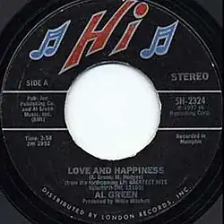 "Love and Happiness" is a song by Al Green from his album I'm Still in Love with You. Green co-wrote the song with Teenie Hodges. It was released as a single in the United Kingdom on London Records in 1973 and in the United States on Hi Records in 1977. It has been covered by Etta James, Al Jarreau, and many other performers.