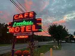 In 1951, Lon and Anne Loveless purchased the "Harpeth Valley Tea Room" on Highway 100 and renamed it the Loveless Motel and Cafe.[4] They originally served only chicken at picnic tables on their front porch, but eventually converted rooms in the house to accommodate a bigger menu and a need for more dining space.[4] They owned the motel and cafe for eight years before selling it to Cordell and Stella Maynard in 1959.[4] In 1973, the Maynards sold the business to Charles and Donna McCabe.[4] Their 12-year-old son George became a full business partner at Loveless in 1982.[4] He expanded the services of the Loveless by creating Loveless Motel and Cafe's "Hams & Jams" mail-order business and catalog.[4]