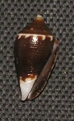 The shell is encircled by finely pricked grooves. It has a chestnut-color with generally a few white spots on the shoulder, and is white-tinted at the base.[2]