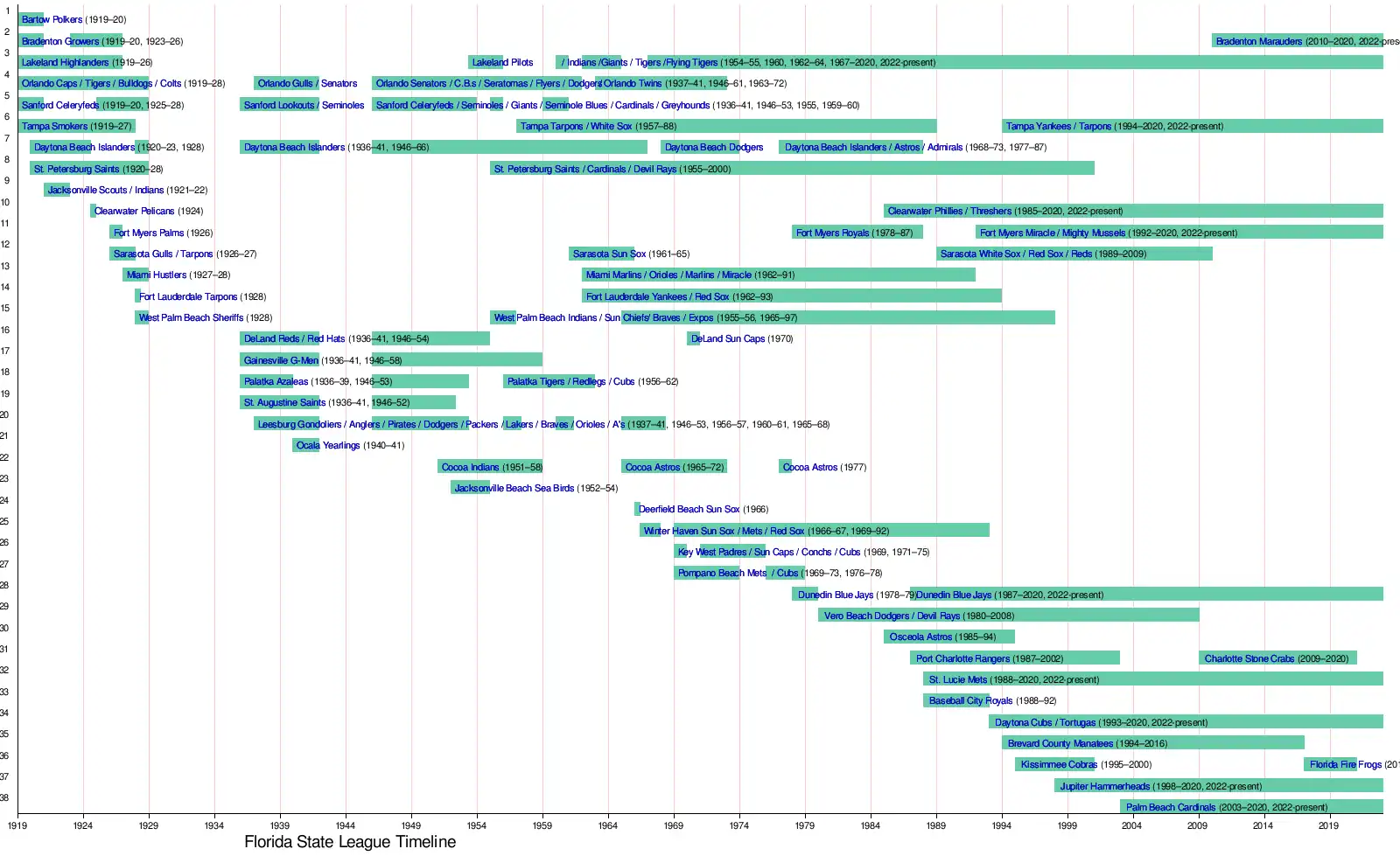 Palm Beach CardinalsJupiter HammerheadsFlorida Fire FrogsKissimmee CobrasBrevard County ManateesDaytona TortugasBaseball City RoyalsSt. Lucie MetsCharlotte Stone CrabsCharlotte RangersKissimmee CobrasVero Beach Devil RaysDunedin Blue JaysDunedin Blue JaysPompano Beach CubsPompano Beach MetsKey West CubsWinter Haven Red SoxWinter Haven Red SoxJacksonville Beach Sea BirdsCocoa AstrosCocoa AstrosCocoa AstrosOcala YearlingsLeesburg AthleticsSt. Augustine SaintsPalatka RedlegsPalatka AzaleasGainesville G-MenDeLand Sun CapsDeLand Red HatsWest Palm Beach ExposWest Palm Beach IndiansWest Palm Beach SheriffsFort Lauderdale YankeesFort Lauderdale TarponsFort Myers MiracleMiami HustlersSarasota RedsSarasota Sun SoxSarasota GullsFort Myers Mighty MusselsFort Myers RoyalsFort Myers PalmsClearwater ThreshersDaytona Beach IslandersJacksonville IndiansSt. Petersburg SaintsSt. Petersburg SaintsDaytona Beach IslandersDaytona Beach IslandersDaytona Beach IslandersDaytona Beach IslandersTampa TarponsTampa Tarpons (1957–1988)Tampa SmokersSanford GreyhoundsSanford GreyhoundsSanford GreyhoundsOrlando RaysOrlando RaysOrlando RaysOrlando RaysLakeland TigersLakeland IndiansLakeland PilotsLakeland HighlandersBradenton MaraudersBradenton GrowersBartow Polkers