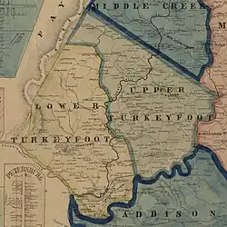 Turkeyfoot Township was formed from part of Brothersvalley Township in 1773, when both were still part of a larger Bedford County; Somerset County was not formed from the western portion of Bedford County until 1795.[3] Just as new counties were split off from earlier counties, new townships were split off from earlier townships, and the townships of Upper Turkeyfoot & Lower Turkeyfoot took their current shapes in 1848.[3] White settlers arrived in the Turkeyfoot area by the late 1760s, and a group of about 15-20 Baptist families came to the area from New Jersey around 1774.[3]