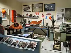 The exhibits on display include a wide range of maritime artefacts including a display of medals awarded to naval and RNLI personnel, a large display of marine art and ships in bottles, the fishing industry in Lowestoft and the town's involvement with the Royal Navy in World War II, a workbench of shipwrights and coopers tools, an extensive collection of ship models in various scales, the workshop of Christopher Cockerell, the inventor of the hovercraft, reassembled at the museum following his death in 1999 and which displays his original tools and machinery including his left-handed lathe,[11] a display about Robert William Hook (1828–1911), coxswain at RNLI Lowestoft from 1853 to 1883 who was credited with saving more than 600 lives during his career, and a small display dedicated to Thomas Crisp, a local man who posthumously won the Victoria Cross during World War I,[12] including his original Memorial Plaque.