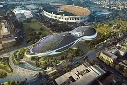 ![]() An architectural rendering of the planned museum in Exposition Park, Los Angeles, California. | |