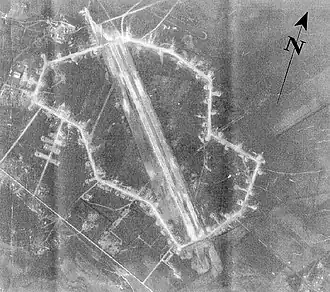 The airfield had parallel, 6,000' x 100' asphalt runways laid over Pierced Steel Planking, oriented 13/31. There were two perimeter tracks, one on each side of the runways.[1] There may have been some temporary hangars and buildings; however, it appears that personnel were quartered primarily in tents, and most aircraft maintenance took place in the open on hardstands. It also had a steel control tower.[1]