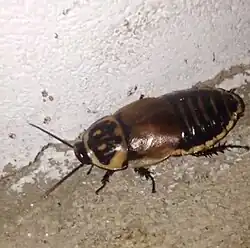 Courtship usually starts with the male stimulating the female, first with his antennae then with his palps. He then pursues her, pushes her, tries to climb on her back and raises his wings. She may run away or she may allow herself to be pushed and starts palpating the male's abdomen with her palps, climbs on the male and allows him to grasp her genitalia, dismounts sideways and turns through 180° so that the pair are linked at the tip of the abdomen. Copulation usually lasts for about an hour. Not every courtship resulted in a mating, the female often turns away half way through, or may climb on the back of the male without proceeding to copulation. Unlike other cockroaches such as the Pacific beetle cockroach (Diploptera punctata) and the orange-headed cockroach (Eublaberus posticus), the females are not receptive just after moulting and it is about twenty days later that they become receptive, by which time their cuticle is well-hardened.[4]