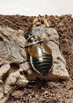L. verrucosa grows to a length of about 4 cm (1.6 in) and is mainly black or dark brown with a white margin to the dorsal sclerites. It is sexually dimorphic, with males being slightly smaller than females and having a pair of large, usually yellow spots on the pronotum.[2] These are covered by a thin translucent cuticle and have traditionally been thought to be luminescent organs.[3] However researchers noticed that when in captivity these cockroaches were fed on carrots, the colour of the spots deepened to orange or even red. On closer examination the surface of the cuticle bears a number of small knobs each bearing a small mechanoreceptor. The upper surface of the spots is partially obscured by a pad of enlarged fat body cells which accumulate carotenoids on a diet of carrots. Insects are unable to synthesize carotenoids and the presence of orange or red spots may indicate a well-fed, fit individual. The researchers found no evidence of spontaneous light emission but hypothesized that the pigmented spots may play a part in male aggression or mate choice by the female, or may provide warning signals,[4] though autofluorescence has been documented, such that the spots will glow when exposed to ultraviolet light.[5]