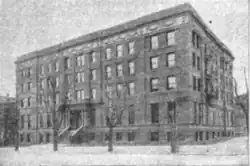 The building faced 130 feet (40 m) on North Capitol Street, and was 80 feet (24 m) deep on the M Street front.[2] Rust Hall was a five-story structure. It contained 115 rooms, of which 15 were for public use. The building accommodated 100 people and provided modern appliances. It was heated by hot water and lit by electricity generated by its own engines and dynamos. It was furnished with elevator and iron stairways. A telephone system connected the institution with the main office. Henrietta A. Bancroft served as chairman of the building committee. Charles W. Gallagher was treasurer and president of the National training school when the building opened.[3]